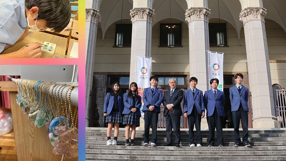 ①海で拾ったマイクロプラスチックでアクセサリーをつくり文化祭の景品に