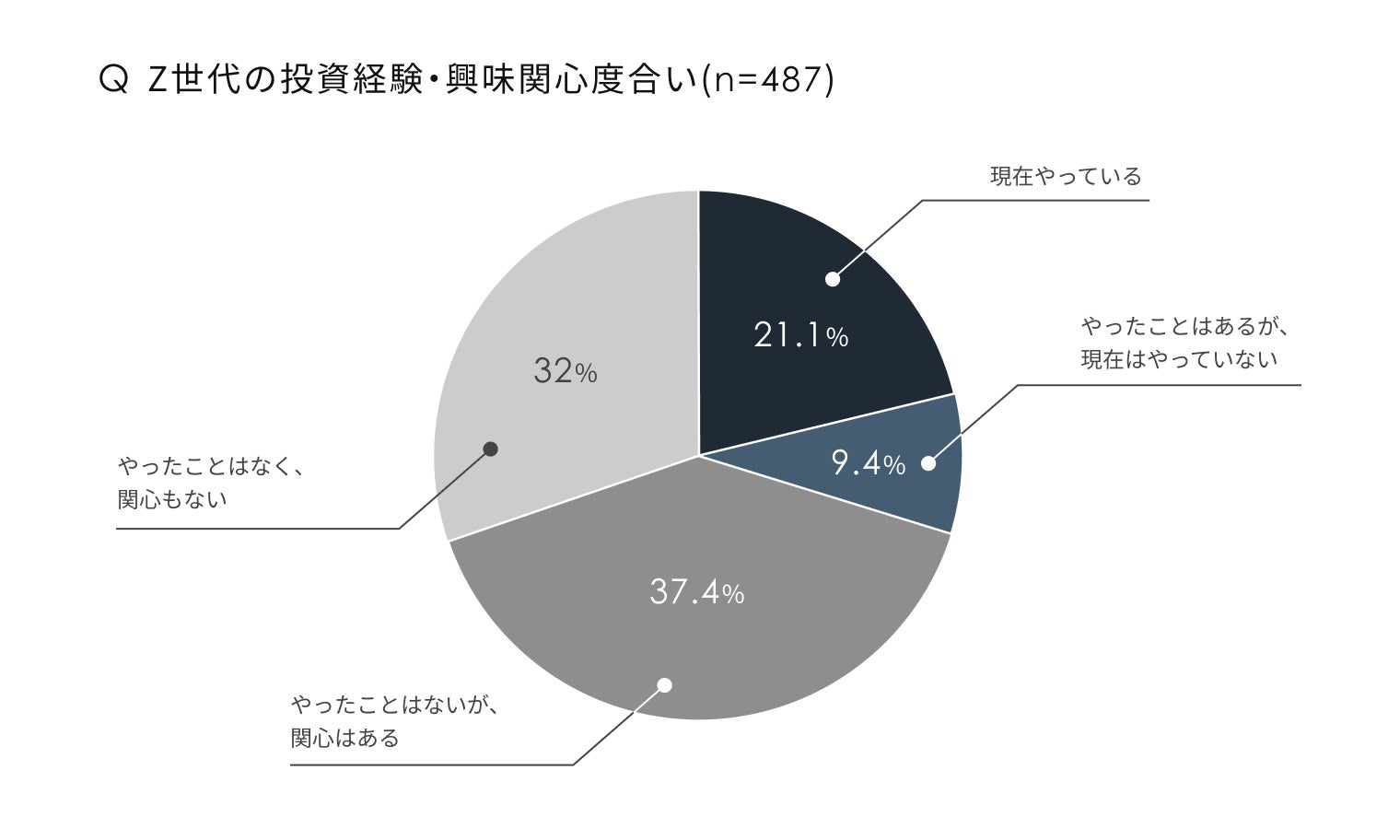 Z世代に対しては「投資経験・興味関心」について尋ねました。投資を「現在やっている」(21.1%)、「やったことはあるが、現在はやっていない」(9.4%)、「やったことはないが、関心はある」(37.4%)、と投資経験あり・もしくは興味・関心を持つ割合は67.9%と約7割にものぼり、「やったことはなく、関心もない」は、わずか(32.0%)でした。