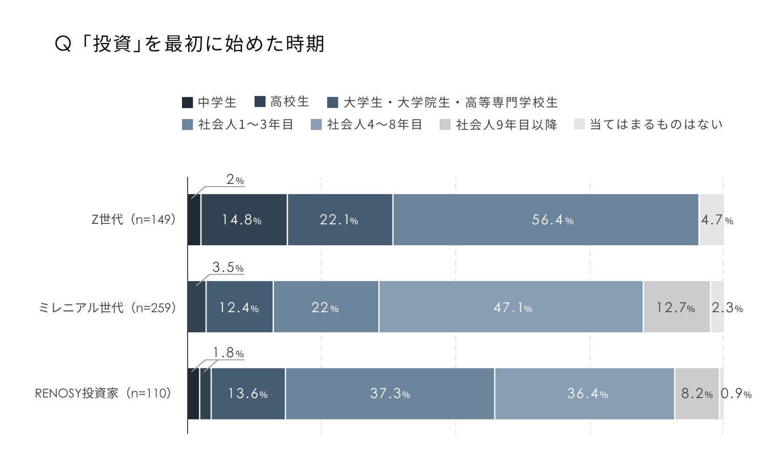 次に「(投資経験者に対し)投資デビューはいつ頃か」と尋ねたところ、RENOSY投資家からは「社会人1〜3年目」(37.3%)が最も多く回答がありました。一方、ミレニアル世代は「社会人4~8年目」(47.1%)が最多であり、同じ世代でも分布に違いが見られます。