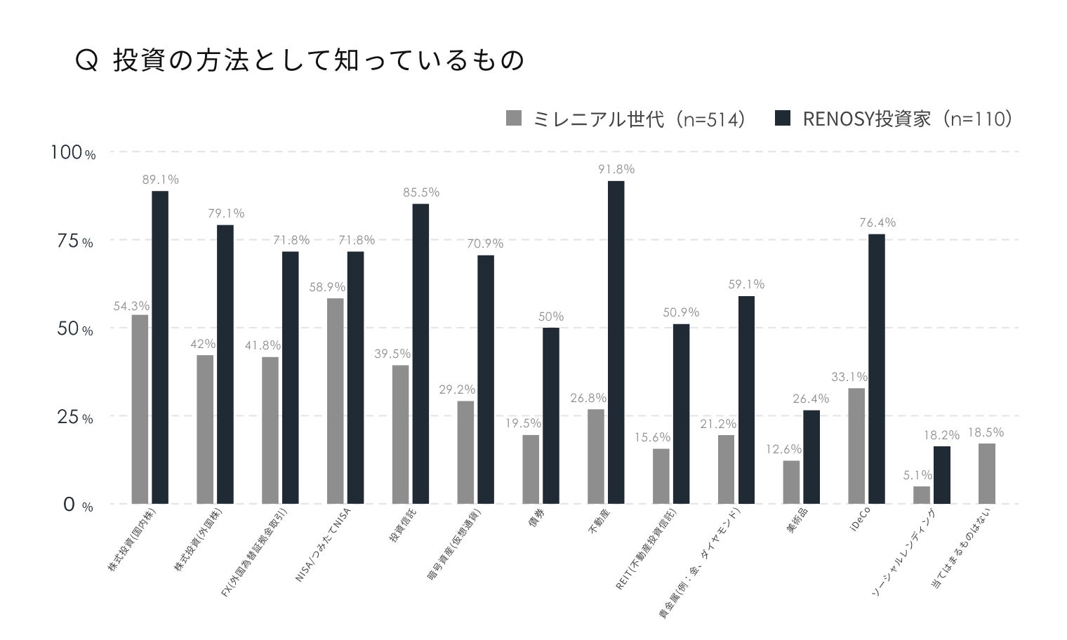 この調査では、他にも年齢層の同じミレニアル世代とRENOSY投資家の回答に違いが見られるものがありました。「知っている投資の方法」について尋ねたところ、ミレニアル世代からはNISA/つみたてNISA(58.9%)、国内株(54.3%)外国株(42.0%)の順に、RENOSY投資家からは、不動産(91.8%)、国内株(89.1%)、投資信託(85.5%)の順に回答がありました。ミレニアル世代とRENOSY投資家では、全ての選択肢に対して「知っている」と回答する割合、および回答の多い選択肢が異なっていることが分かります。