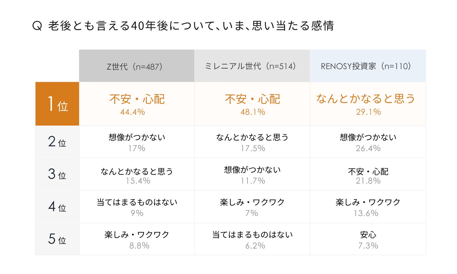 Z世代・ミレニアル世代・RENOSY投資家それぞれへ「老後とも言える40年後について、今どう思うか」を尋ねたところ、Z世代・ミレニアル世代の最多回答は「不安・心配」(Z世代:44.4%/ミレニアル世代:48.1%)であることが判明しました。一方、RENOSY投資家の最多回答は「なんとかなる」(29.1%)になりました。