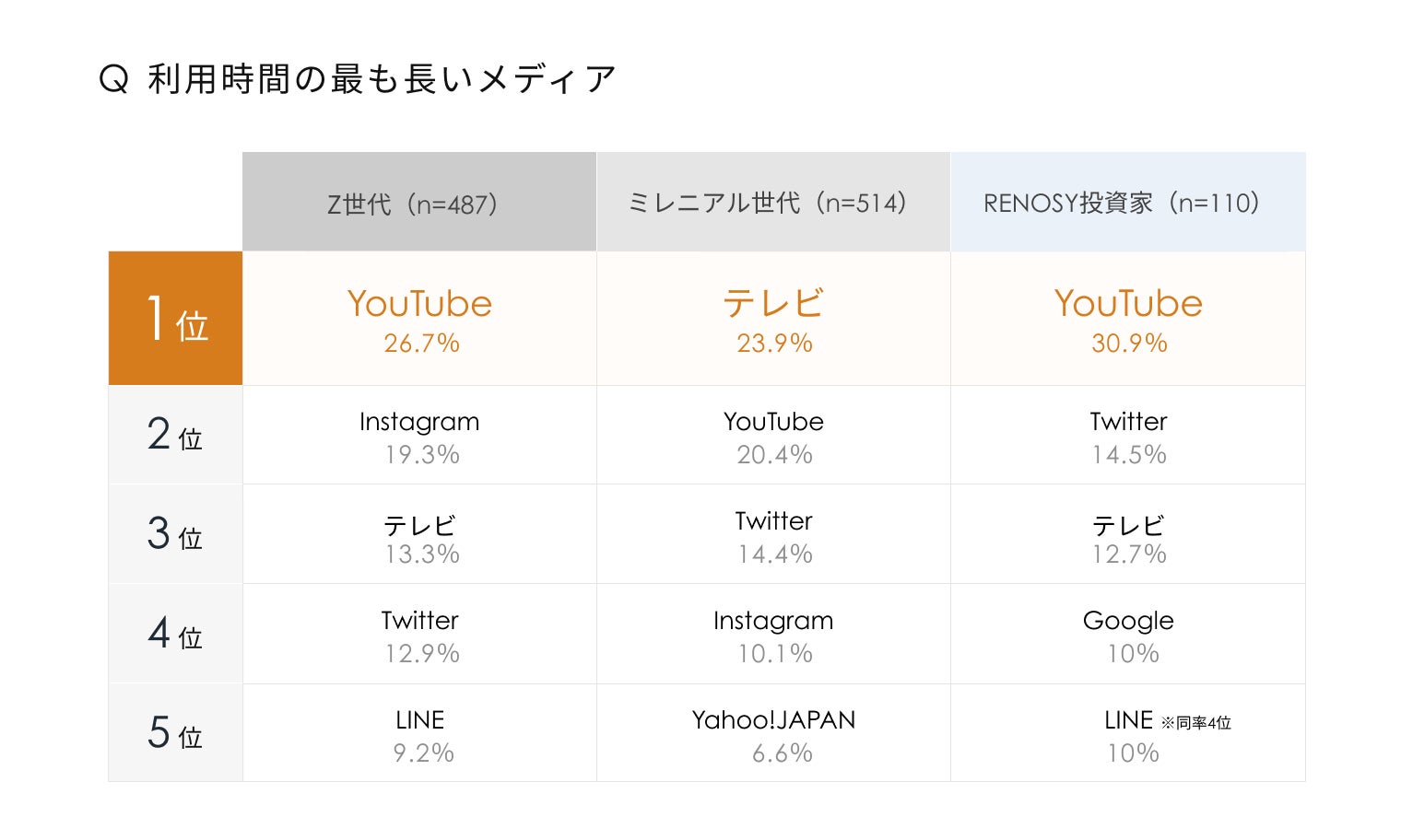 最後に、3グループそれぞれへ「最も利用時間の長いメディア」について尋ねたところ、Z世代はYouTube(26.7%)、Instagram(19.3%)、テレビ(13.3%)、ミレニアル世代はテレビ(23.9%)YouTube(20.4%)、Twitter(14.4%)、RENOSY投資家はYouTube(30.9%)、Twitter(14.5%)、テレビ(12.7%)の順に回答がありました。3グループともに、情報収集にはYouTubeやテレビのような流し見も可能な動画コンテンツが人気であることが分かります。