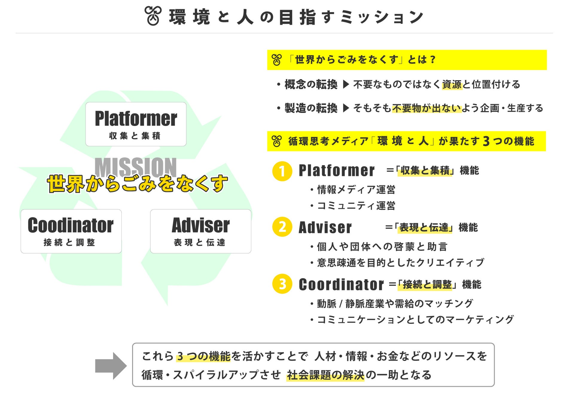 循環思考メディア「環境と人」は、何も捨てないビジネスの仕組みやごみから価値を創る取り組みなど、「環境に関わる知られていない事実や知識」を生活者・企業・団体に届ける情報プラットフォームです。