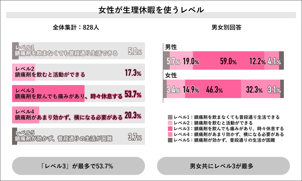 回答者全体の828人に生理休暇を利用する”症状のレベル(※3)”を聞くと、「レベル3」が53.7%で最多回答になり、次いで「レベル4」が20.3%、「レベル2」が17.3%で上位3つの回答結果になりました。これを男女別に見ていくと、「レベル3」の回答は男性が59.0%に対して、女性の回答は46.3%、「レベル4」の回答は男性が12.2%に対して、女性は32.3%と、生理による体調不良が原因で休暇をとるレベルは、男性が思う症状レベルよりも、女性の方が症状レベルが高い結果になりました。