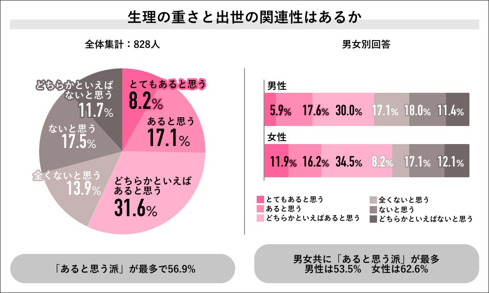 回答者全体の828人に生理の症状の重さが出世に関連しているか否かを聞くと、「とてもあると思う」8.2%、「あると思う」17.1%、「どちらかといえばあると思う」31.6%を合算した、56.9%が”関連ある派”の回答をしました。”関連なし派”の回答は43.1%でした。また”関連ある派”を男女別で見ていくと、男性回答は53.5%に対して、女性回答は62.6%になり、女性の方が出世に影響する意識が高い結果になりました。