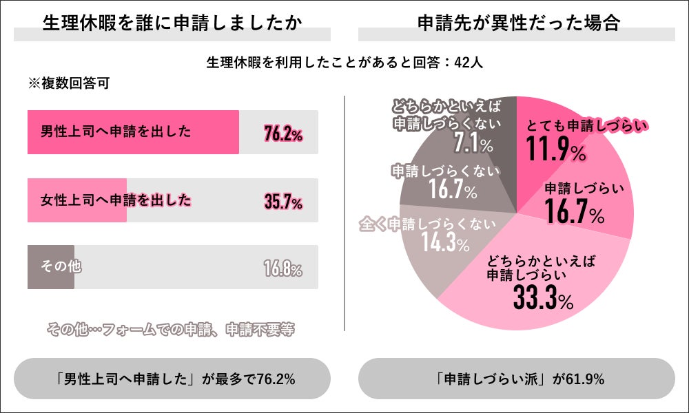生理休暇の取得経験があると回答した42人に取得の際の申請先を聞くと、「男性上司」が76.2%が最多回答で、次いで「女性上司」が35.7%、「その他」が16.8%の結果になりました。