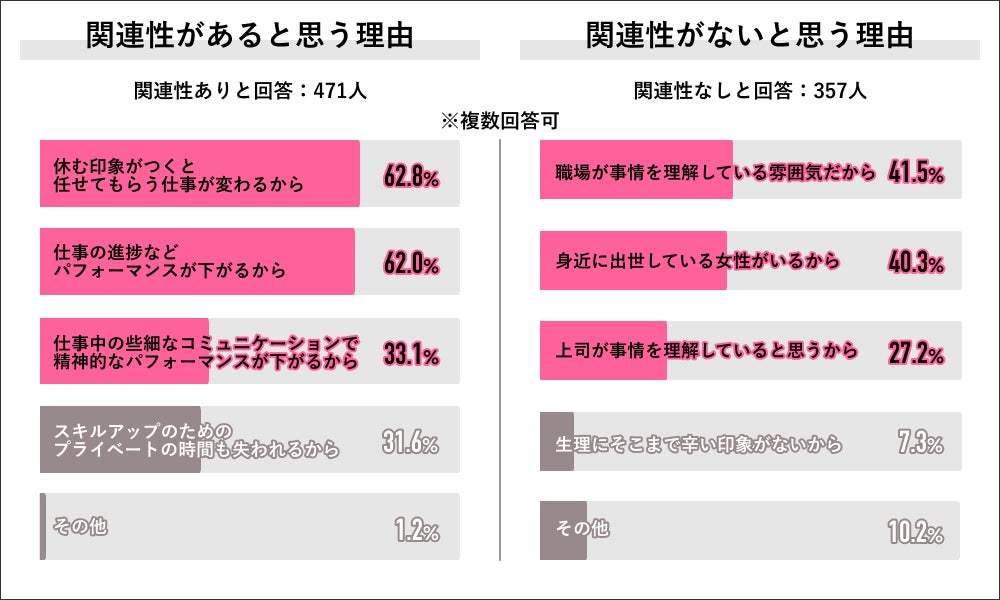 生理の重さと出世には関連が“ある派”を回答した471人にその理由を聞くと、「休む印象がついて任せてもらう仕事が変わる」が62.8%で最多回答になり、次いで「仕事のパフォーマンスが下がる」が62.0%、「コミュニケーションなど精神的なパフォーマンスが下がる」が33.1%、「スキルアップのための時間奪われるから」が31.6%で上位4つの回答になりました。