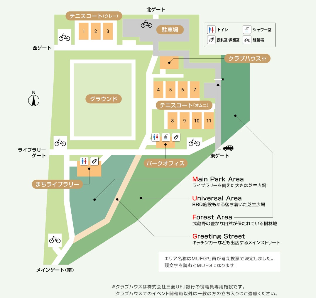 「MUFG PARK」は、古くから生活と自然が密接している武蔵野の地に開園いたします。大きな芝生広場やテニスコートなどのスポーツ施設、武蔵野の面影を感じられる樹林地エリアや皆さまの交流を育む“まちライブラリー”を有しています。五感で四季の移ろいを感じながら、幅広い世代の交流広場としてご利用いただけます。「 MUFG PARK」では、PARKや周辺地域の特性を生かして「自然」、「健康・スポーツ」、「食と農」、「防災」の4つのテーマを基本としたイベントの開催を予定しています 。