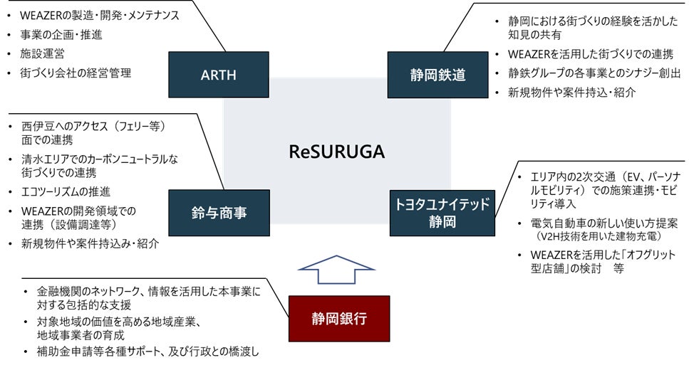 本事業を通じて、鈴与商事においては、エネルギーマネジメントシステムや分散電源管理に資する知見の深化、エネルギー関連設備、建設・住宅設備等の納入を支援し、 清水区エリアにおけるグループ事業とのシナジー創出等を図ってまいります。 また、静岡鉄道においては、「WEAZER」を活用した新たな価値創造や、地域資源を磨き上げ、最大限に活用した街づくりを推進することで、脱炭素社会における「環境」と「経済」が両立した街づくりの実現に取り組んでまいります。トヨタユナイテッド静岡については、西伊豆エリアでのEV等のモビリティ導入や電気自動車の多様な使い方提案(V2Hによる建物充電)等に活かしてまいります。地域の金融機関である静岡銀行は、本事業を推進するARTHを2022年度のしずぎん起業家大賞最優秀賞に選定し、今回のReSURUGAに対しても包括的に支援し、複雑化、多様化する地域課題の解決に取り組んで参ります。