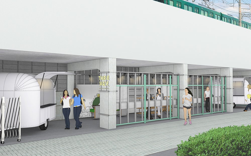 高架下の荒々しさを敢えて残し、カウンター、ベンチ、テーブルなど、一人でも大人数でも楽しめる可変的な空間で、昼と夜で異なる表情、飲食シーンを提案しています。