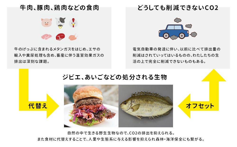 植林などによるCO2の削減が代表例として挙げられますが、私たちは徳島県で処分される害獣(ジビエ)、未利用魚(アイゴ)を利用することで取り組みます。