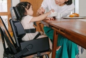 2022年4月に発売した「IKOUポータブルチェア」は、家の中でも外出先でも利用できる折りたたみ式のキッズチェアです。体幹が弱いという身体的チャレンジを抱える子どものニーズをベースに開発し、乳幼児が安定して座ることができる仕様となっています。大人用の椅子への取り付けは簡単で、床などへの直置きも可能なため、外食やスポーツ観戦、ピクニックやキャンプでの活用等、家族の行動範囲が広がります。