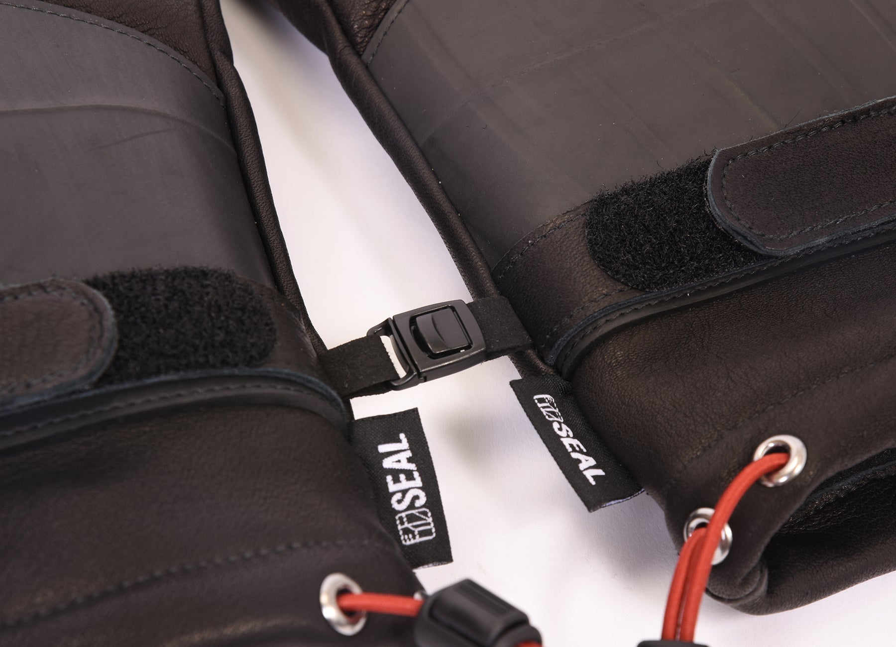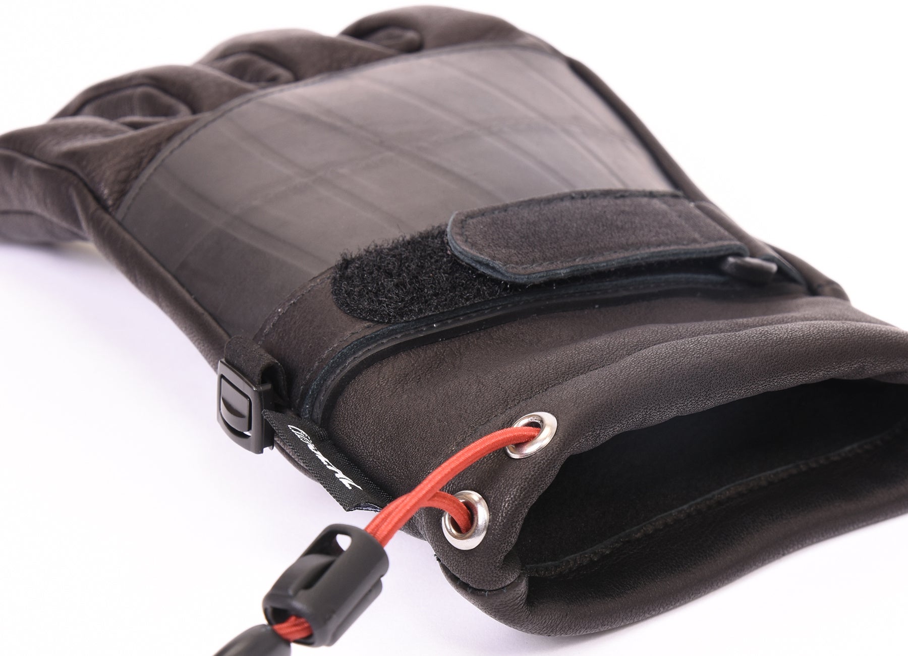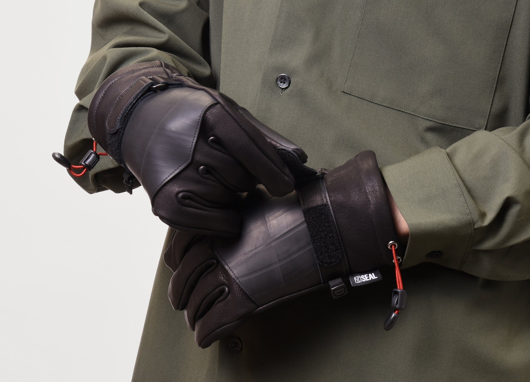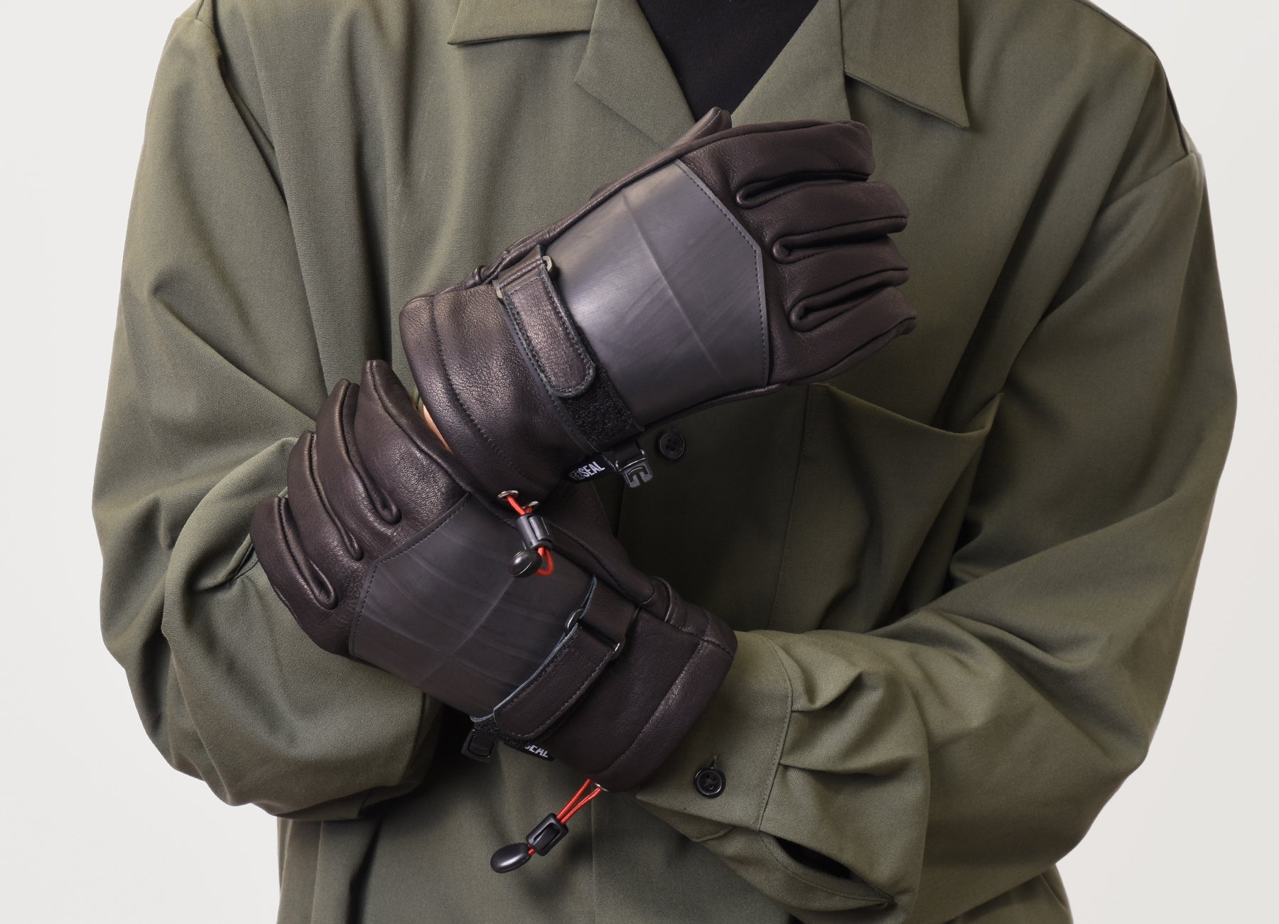 廃棄されたタイヤチューブと本革を組み合わせ、120年以上の伝統を持ち国内産手袋の産地である香川県の職人の手により作られた、使いやすさと強度を兼ね備えたグローブです。手の甲や指周りには防水性と耐久性を兼ね備えたタイヤチューブを採用し、指先の動きに合わせた立体縫製により違和感なく手に馴染む製品が完成しました。人指し指部分には導電糸刺繍を施す事により、スマートフォンやタッチパネルも手袋をはめたまま操作が可能です。内側の生地には滑らかなマイクロフリースを採用し、甲部分と掌部分の内装の厚さを変えることにより暖かさを保ちながらグリップのし易さを両立した製品です。