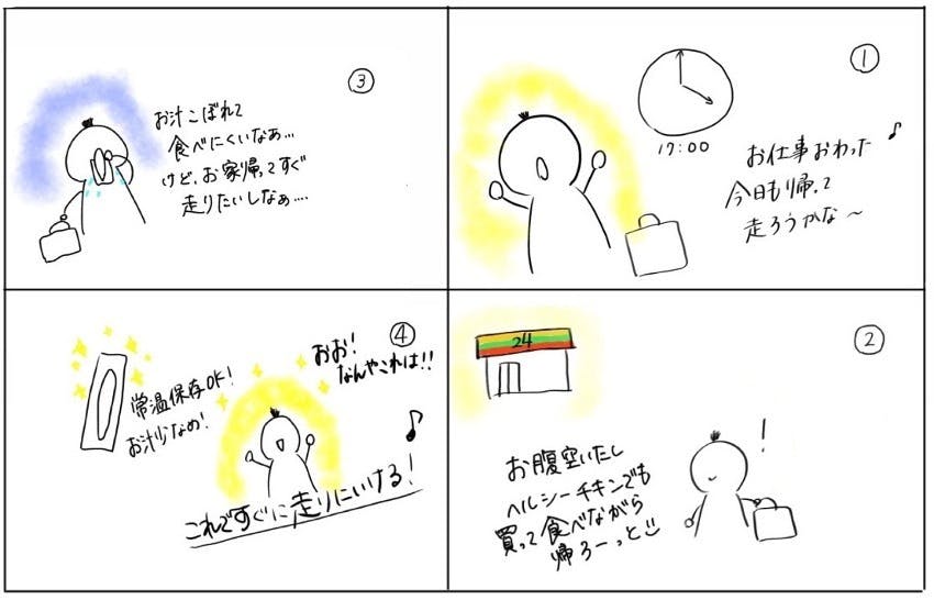 既存のヘルシーなチキンなどは「お汁がこぼれそうで食べにくかった」という経験はありませんか?”どこでも補給肉“は汁気が少なく、食べやすい形状です。街でランニングをする時やゴミ箱がない時でも安心して持ち歩けます。こぼれる心配が少ないので、移動中やデスクワークの合間などでも気にせず食べられます。