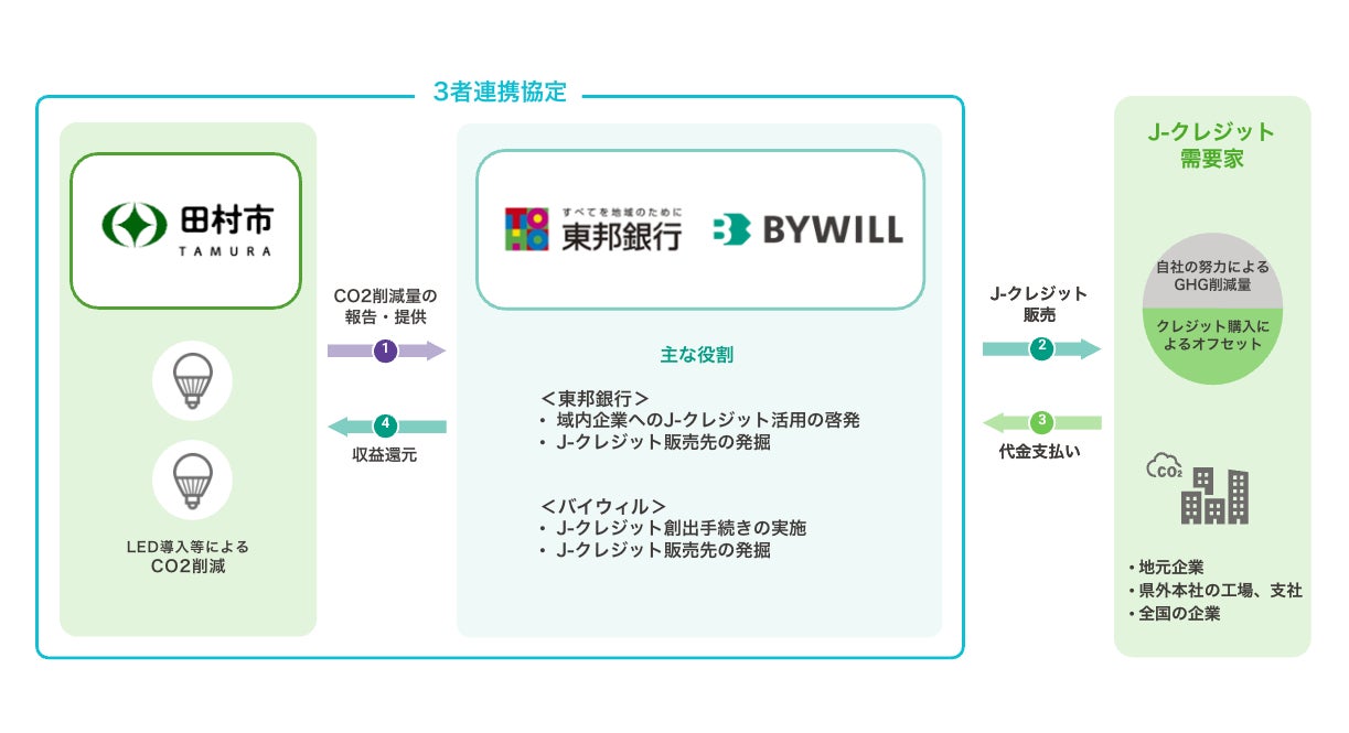 バイウィルは、田村市におけるJ-クレジット創出プロジェクトの登録・申請からモニタリング、創出したクレジットの販売までをシームレスに支援します。また、販売に関しては、東邦銀行とも協力し、「地産地消」によって田村市をはじめとする地域の脱炭素化を促進します。