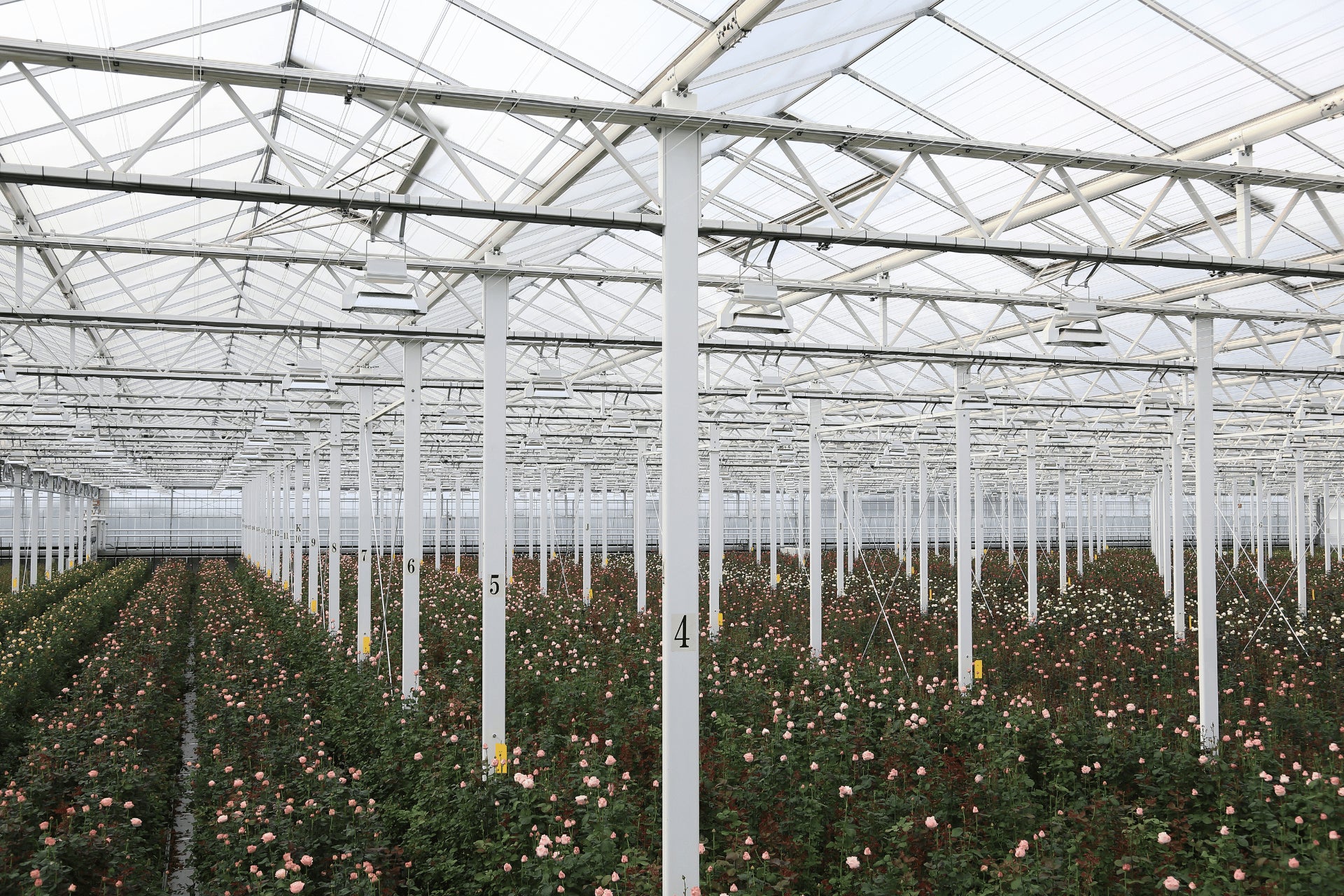 最新鋭の設備を備えた約5000坪の大温室は、見渡す限りバラの花園