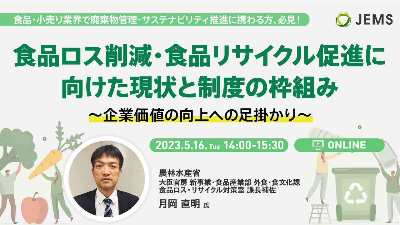 「ITで環境問題に挑む」をコーポレートスローガンに掲げる株式会社JEMS(本社:茨城県つくば市、代表取締役:須永裕毅)は、2023年5月16日(火)に食品業界の廃棄物管理および資源循環に携わる担当者様向けに、「食品ロスの削減・食品リサイクル」をテーマとした無料オンラインセミナーを開催します。