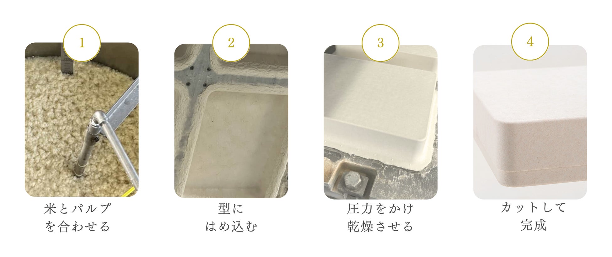 まずは、お米を細かく粉砕したものとパルプを一体化した素材を、特殊な方法で金属型に均一に伸ばします。次に、圧力をかけながら一気に乾燥させることで継ぎ目の一切ないスムースな表面の形状が作られます。kome-kami BOXはこの製造方法によって従来の紙製品とは一線を画す滑らかなフォルムを実現できました。